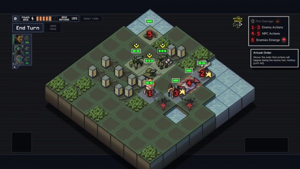 像下棋一样,“举棋未定”,通过观察攻击及其结果是很有帮助的。可以多次使用撤销按钮来移动你的机甲,但是一旦你发起攻击,就不能回头了。只有当制定出最具潜在伤害的行动并使受到威胁的建筑得到有效保护后,才开始攻击。