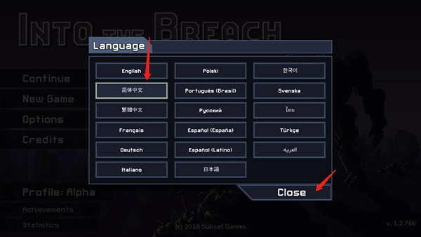 3、在语言选项中选择简体中文,然后点击Close;