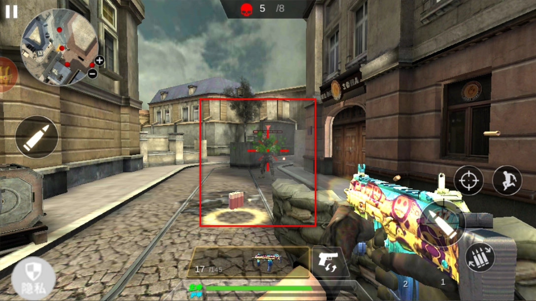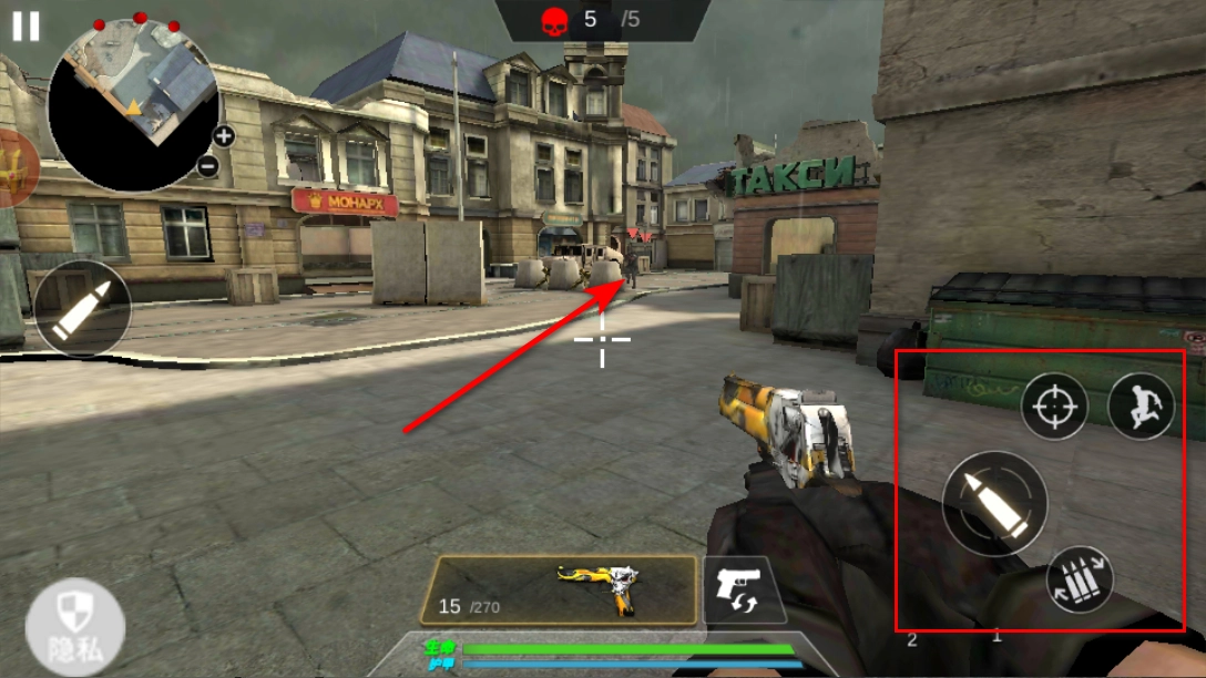 进入游戏后,操控角色在街头场景中移动,借助右侧的射击、奔跑等按钮,瞄准敌人展开攻击,与此同时要留意躲避敌人的反击。