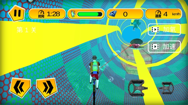 屏幕右侧配备了加氧、加速等辅助功能按钮,当氧气不足时,点击加氧按钮即可补充氧气,确保骑行能够持续进行,从而争取在更短时间内完成关卡。