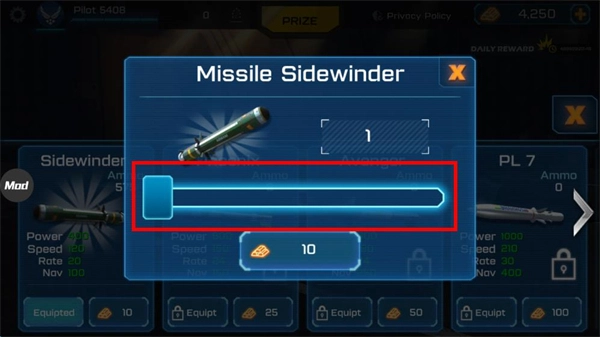 在导弹购买详情页面,可拖动进度条来选定购买数量,确认操作后系统将扣除对应的货币。