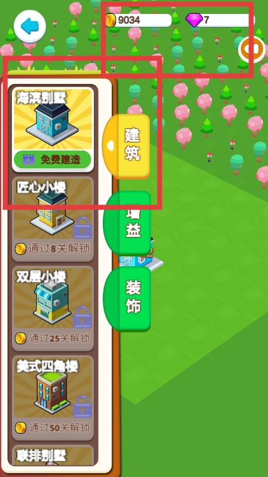 进入建筑界面后,挑选已解锁的房屋,花费金币进行建造,再将其放置到家园场景中,从而打造出专属于自己的迷你家园布局。