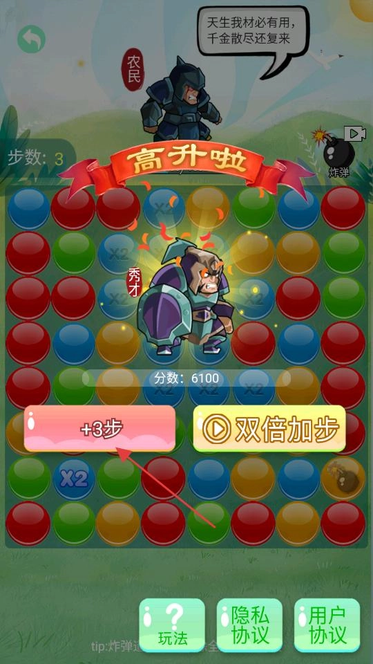 完成消除目标后,角色将晋升为秀才,界面会弹出“高升啦”的提示并展示当前分数。此时点击+3步按钮,就能获得额外的步数,进而继续进行后续的消除挑战。