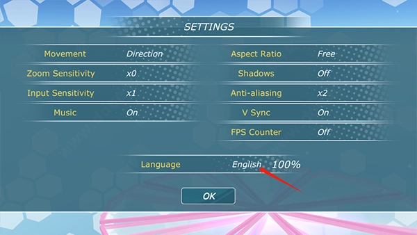2. 进入设置界面后,点击【Language】选项旁边的【English 100%】按钮。