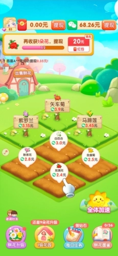 春天花园红包版正版是一款有趣的花园种植模拟游戏,里面包含了不少精彩内容。玩家进入游戏后,首要任务就是种植花朵,而且可供选择的花种十分丰富。游戏开局会提供一块土地,你可以在上面栽种玫瑰、百合、康乃馨等各类心仪的鲜花。不同品种的鲜花成熟后,售价也各不相同。只要完成种植任务,就能领取红包奖励,快来春天花园这款赚钱游戏里试试吧。
