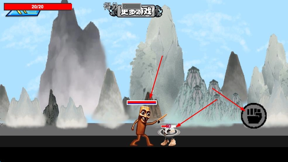 在关卡中操控角色移动,碰到黑球敌人时,点击右侧的拳头图标发起攻击,同时要留意自己的血量和当前得分。
