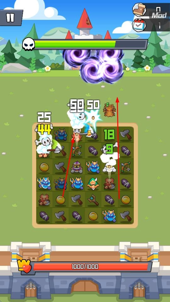 把武器和角色部署到棋盘上,它们会自动攻击前来的怪物。通过合并武器和利用技能效果,就能守护城堡并推进关卡。