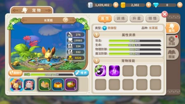可以看到,皮皮骚55级的长耳狐已经拥有276点攻击,19985的生命,334的物理防御以及332的魔法防御。而在乐园玩法中将长耳狐设定在不同的位置则可以获得不同的属性,其中的爱心园长更是全属性继承哦,直接让你的战力飙升。