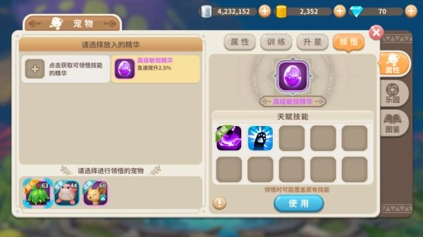 在宠物界面的属性面板中,可以看得到宠物目前的等级以及一个基础的属性值的情况,而玩家可以通过点击宠物栏上的喂食按钮对宠物进行喂食,也就是升级。