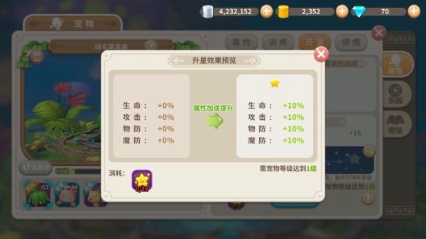 而升星玩法就更加简单直观了,玩家可以通过消耗宠物升星所需要消耗的道具来让宠物升星,可以看到,升星带来的直接是全属性增加10%的超强提升,由于升1星就需要18个消耗品,皮皮骚这个刚回归的人来说根本没有,所以也没法为各位勇士们带来第一手的升星属性加成图,不过之后有机会皮皮骚会补上的。