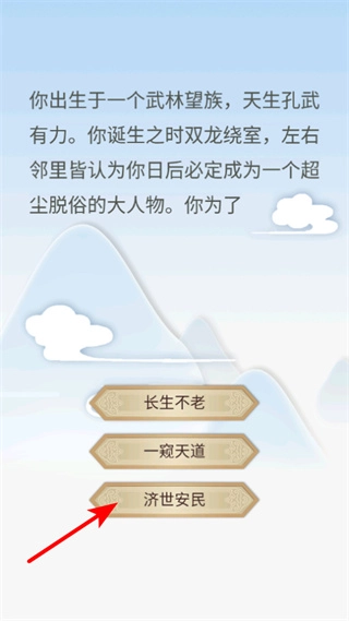 2、在人生目标选择界面,选择“济世安民”并确认该修仙目标,这会对角色的发展路径产生影响,有助于让修仙之路更具明确方向。
