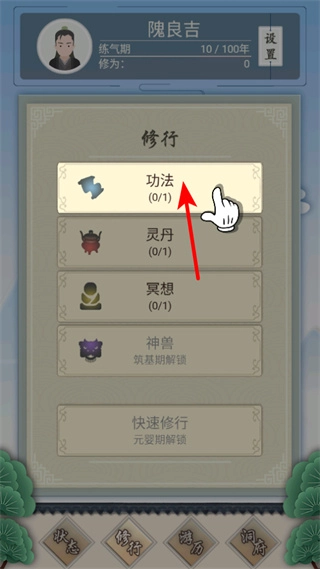 4、进入修行界面后,找到并点击功法选项,通过学习功法能够提升战力。功法作为修仙战斗与属性提升的核心所在,能够帮助玩家快速增强自身实力。