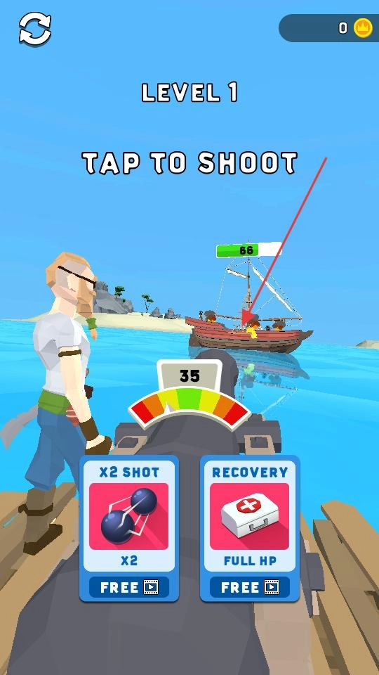 把目光对准远处那条显示着100点血量的帆船,点击屏幕就能发射炮弹,只要击中帆船就能减少它的血量,让游戏继续往前推进。