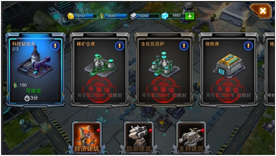 在游戏主界面点击建造图标后会弹出一个列表,列表里的每个图标都对应着一种设施,图标下方标注着该设施的名称,以及修建它所需的资源和时间。