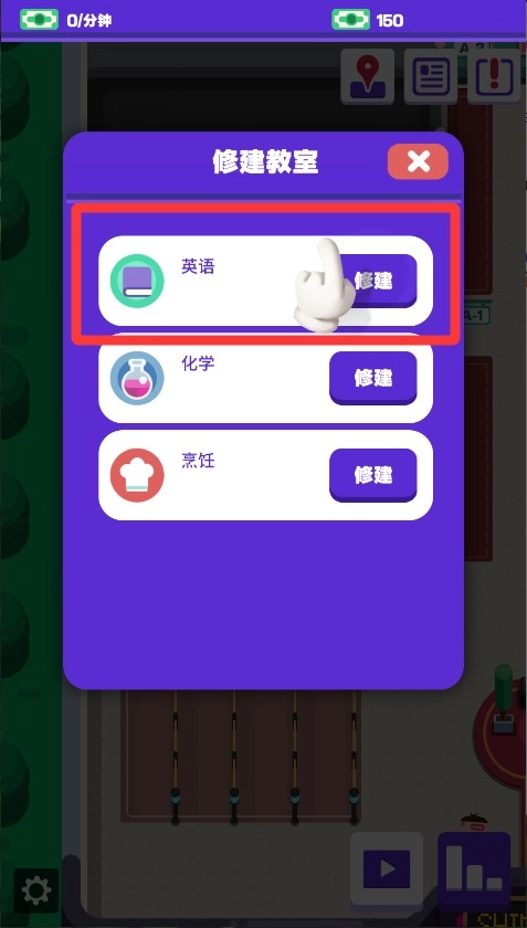 点击修建按钮来扩建学校的设施,一开始先建两间基础教室就可以了,不要把钱全部花完,得留着后面用来招聘老师。