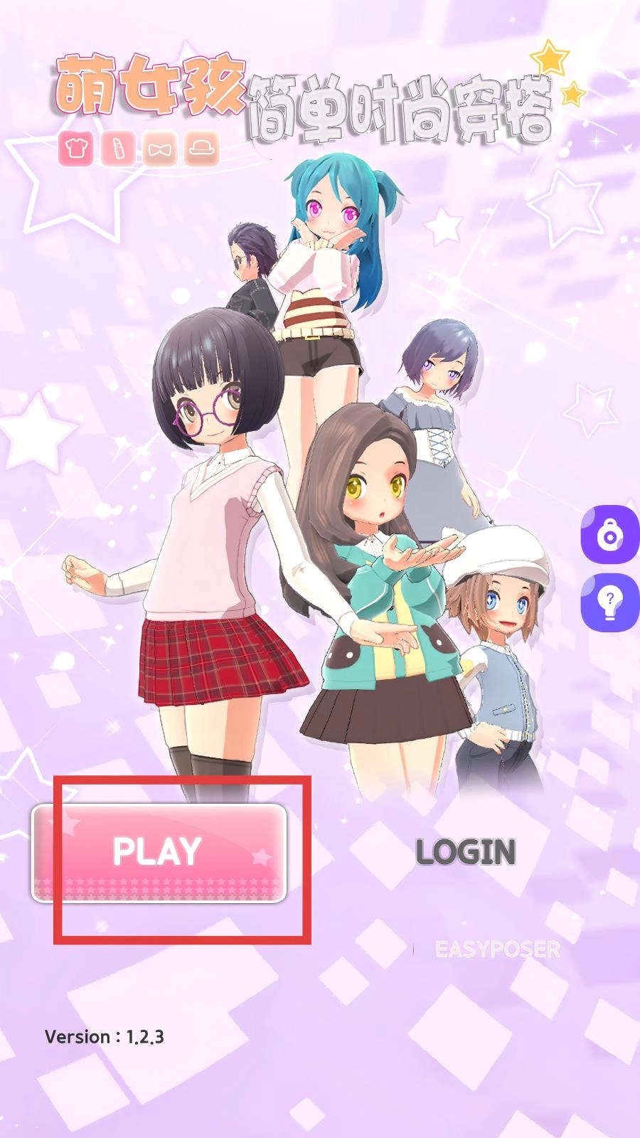打开萌女孩简单时尚穿搭后进入初始界面,该界面呈现出游戏标题、角色形象以及PLAY和LOGIN按钮,点击PLAY按钮,即可进入角色穿搭编辑页面,为角色装扮做准备。