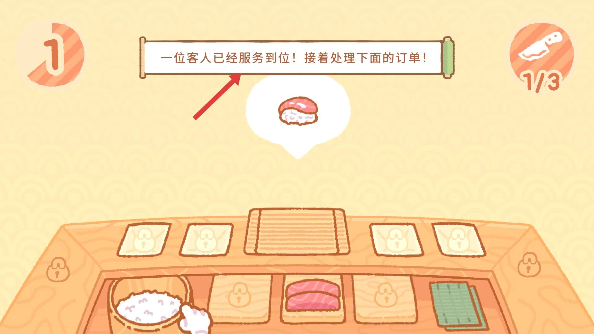 完成一位客人的订单后,接着处理新的订单,按照提示挑选食材制作相应的寿司,不断为客人提供服务以推进关卡。