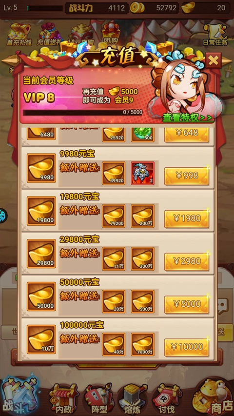 创建角色就送VIP5,还有648元的元宝红包,VIP商城里1元宝就能购买商品