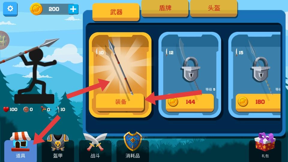 进入游戏后前往道具界面,就能看到武器、盾牌、头盔之类的装备;既可以消耗金币来装备武器,也能解锁其他武器,以此增强战斗能力。