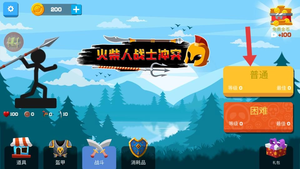 玩家进入战斗选择界面后,会看到普通与困难两种模式,选择普通模式即可开启火柴人战士的战斗征程。
