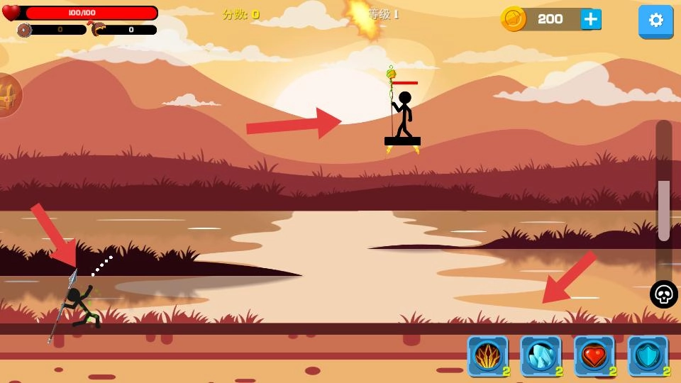 在激烈的战斗场景里,你将操控火柴人战士,借助各类武器对敌人发起攻击,同时还能运用下方的技能——比如火焰、冰冻等效果,来为战斗提供助力。