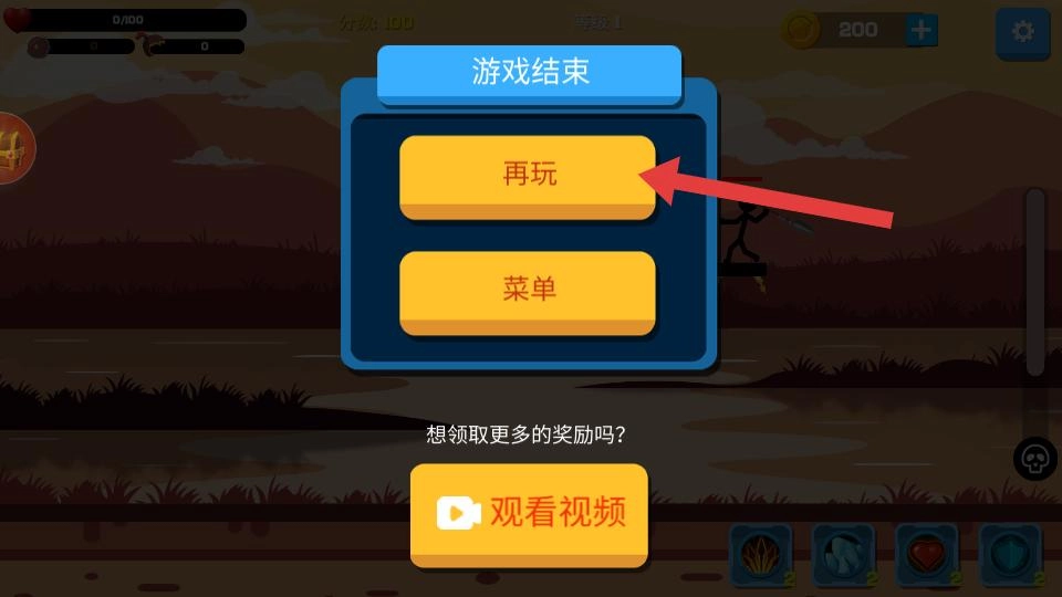 游戏结束后,界面会呈现“再玩”与“菜单”两个按钮。若点击“再玩”按钮,就能重新开启游戏,让火柴人战士的战斗继续进行。