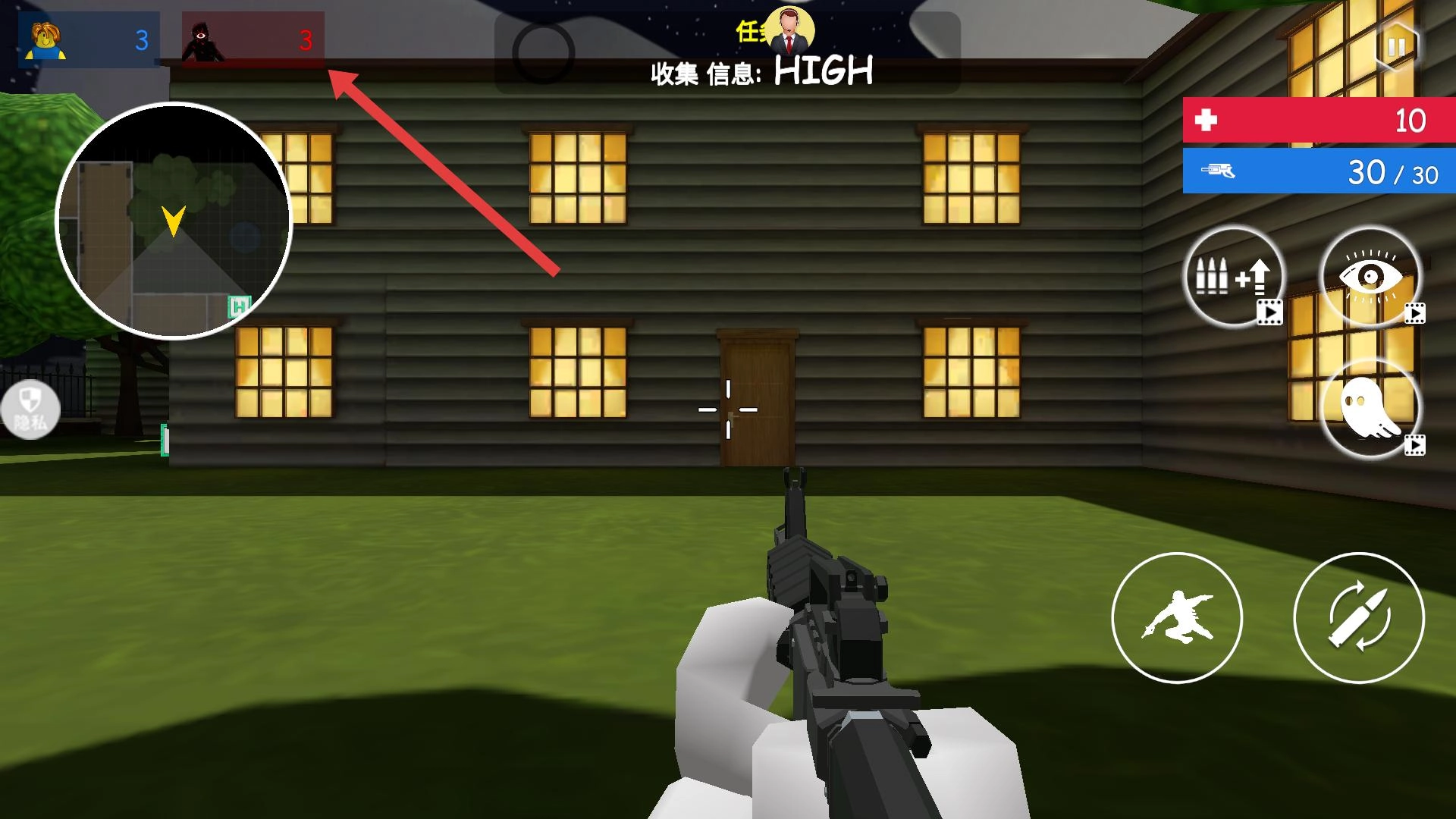 进入房屋场景后,要留意屋顶的敌人,借助小地图观察他们的位置,用武器进行瞄准,同时注意自身的血量和弹药情况,逐步推进并收集相关信息。