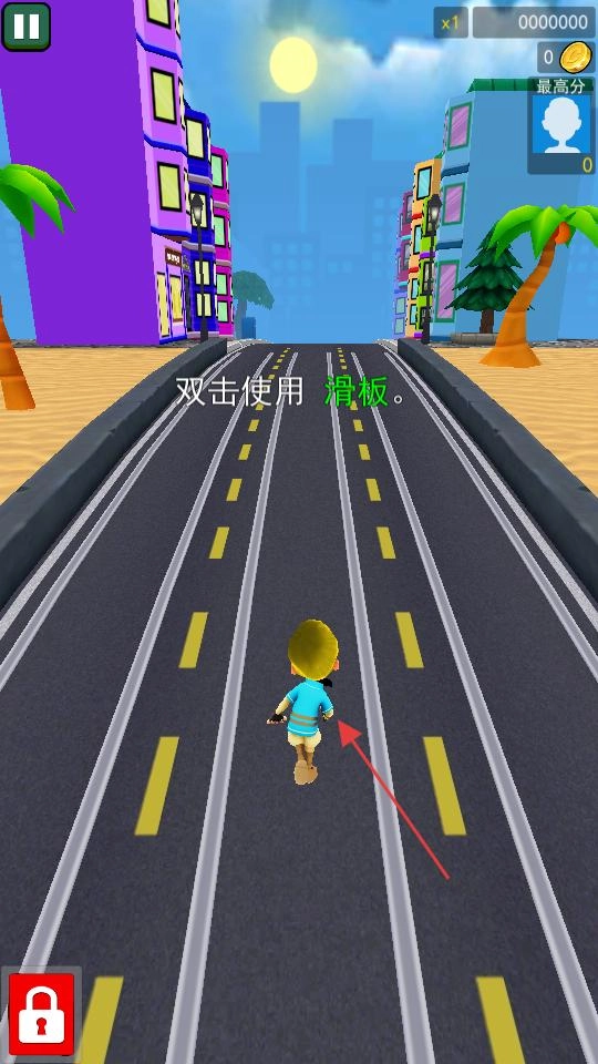 继续进行跑酷,界面提示双击可使用滑板,迅速双击屏幕就能激活滑板道具,利用滑板实现加速,越过障碍,让跑酷之旅得以延续。