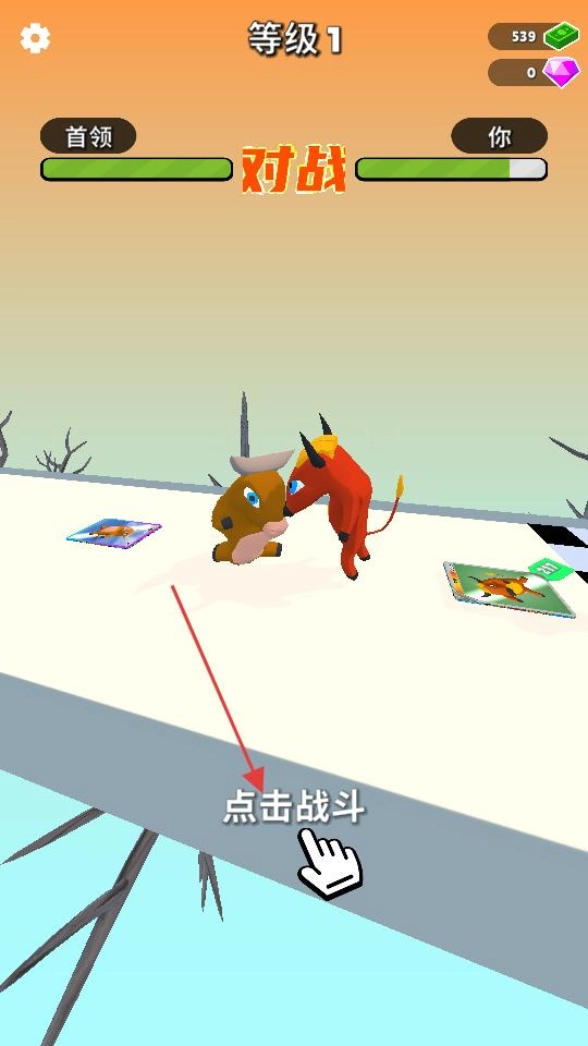 接下来进入对战场景,界面会呈现首领和你的生命值条,同时出现点击战斗的提示,点击后就能操控卡牌对应的角色,与敌方角色展开对战。