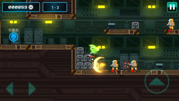 躲避敌人的攻击,敌人发射的都是直线飞行的子弹,这些子弹飞行速度慢,敌人换弹的速度也慢。单个敌人时,躲避和击杀都很容易,但敌人数量增多后难度就会上升。这时需要充分利用二段跳功能,仔细观察子弹的位置,通过灵活的二段跳躲避子弹,同时在躲避的间隙寻找机会消灭敌人。