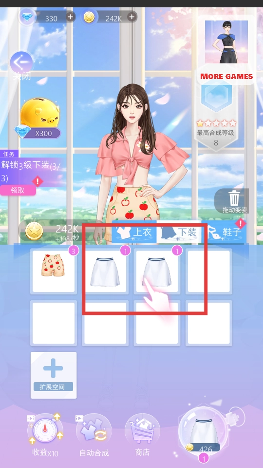 服装合成是核心玩法之一,点击下装按钮后会展示各类服装,遇到相同款式的服装时,把它们拖拽到一处就能完成合成,合成后可解锁更高级别的服装。