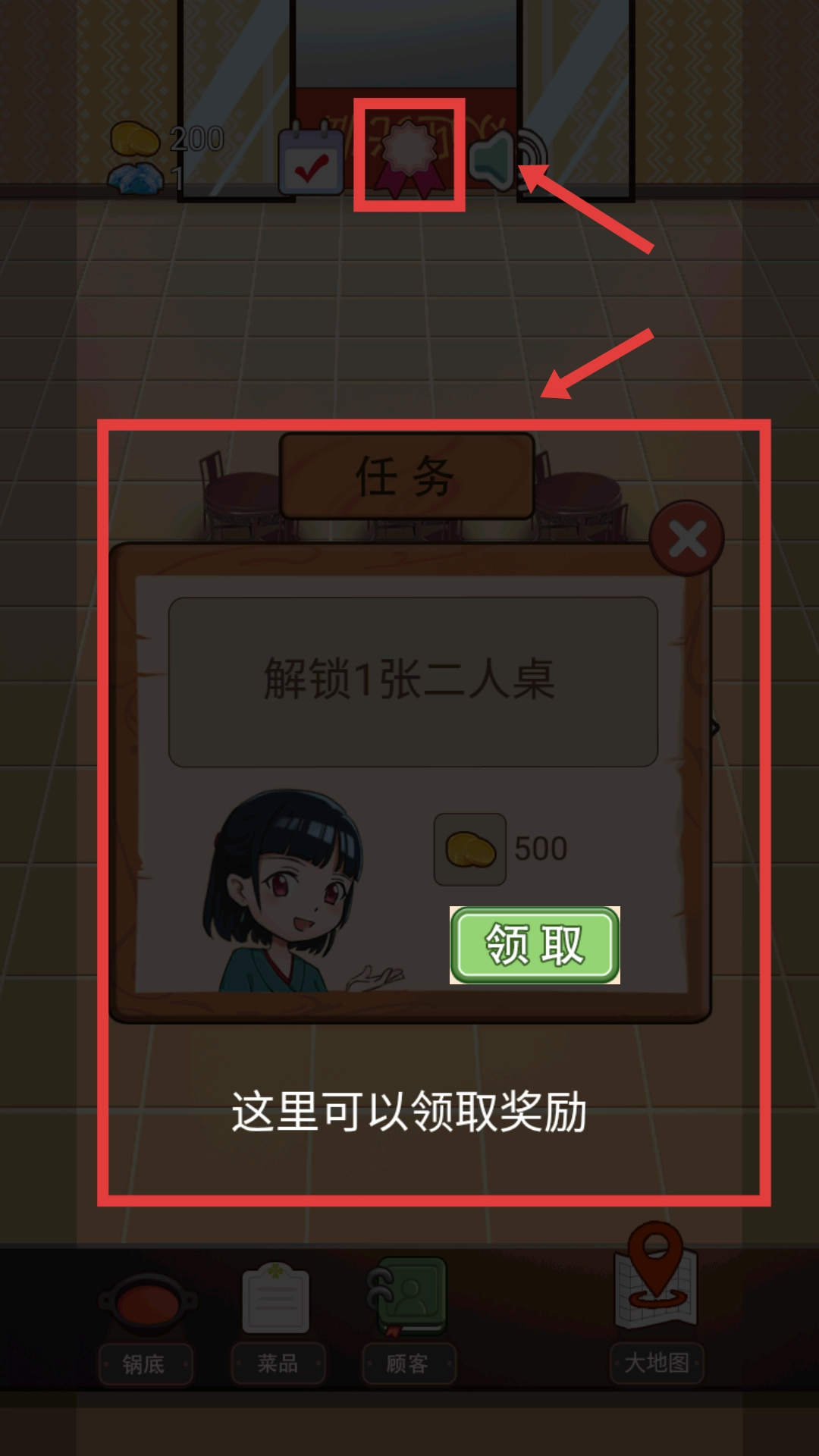 添加桌子后,点击顶部的任务勋章图标,即可弹出任务界面。该界面会展示“解锁1张二人桌”等任务内容,完成对应任务后点击领取按钮,就能获取金币等奖励。