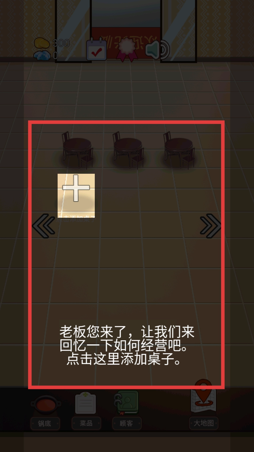 进入店铺场景后,界面会展示火锅店的内部空间,能看到桌椅的摆放区域,底部设有锅底、菜品等功能栏,按照提示点击此处添加桌子,点击对应区域的加号标识即可。