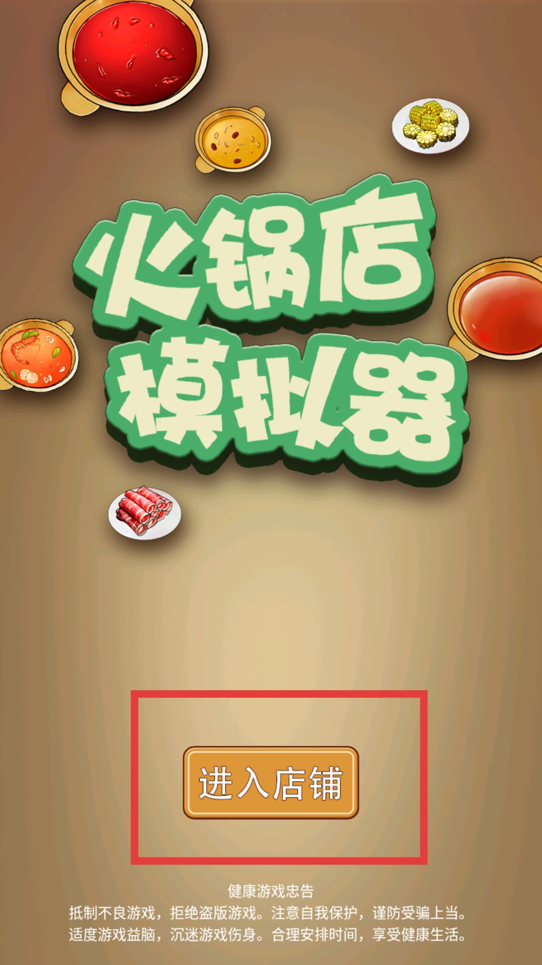 打开火锅店模拟器,进入初始界面。界面上会呈现火锅店模拟器的标题,以及锅底、菜品等火锅相关元素。点击界面下方的“进入店铺”按钮,即可加载并进入火锅店的经营场景。