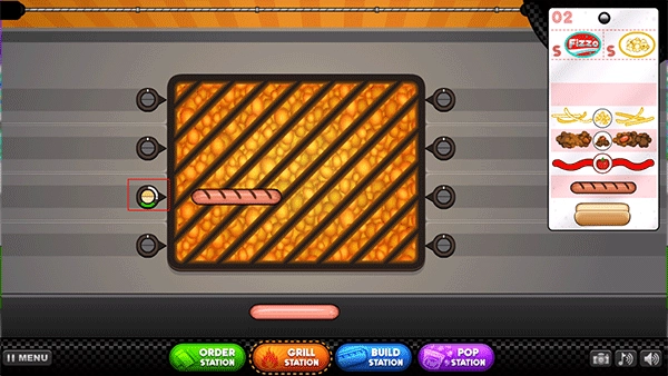 先把热狗放在烤炉上,留意左边指针的颜色,等指针变成橙色时就再次点击热狗给它翻面。(要注意别让它烤焦了)
