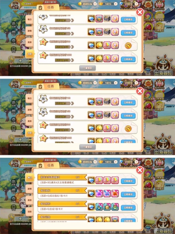 对于刚接触游戏的新手而言,前期每天的活跃度任务是一定要完成的,每天花10到15分钟就能拿到不少钻石,另外还有威望、保级符这类奖励,整体的性价比相当不错。