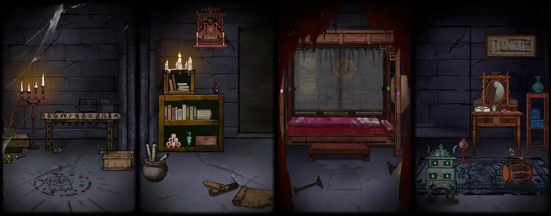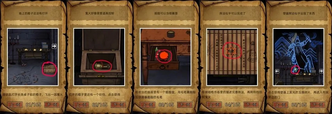 阵法场景中,先把蜡烛摆放妥当,用火柴点燃,接着将朱砂粉置于阵法内。13、灵堂场景下,点击左上角的蜘蛛网,进入一笔画游戏,即可获取蜘蛛。14、切换场景后,再次返回灵堂场景,点击左上角的蜘蛛网,就能得到苍蝇。15、点击地上的夹子,把苍蝇放入其中,切换场景,便能获得蟾蜍。