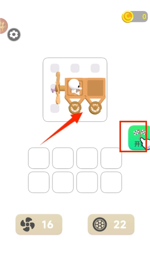 游戏界面的左侧摆放着各种各样的木质零件,第一步得先拾取扇叶部件,这样才能完成动力装置的拼接组合。