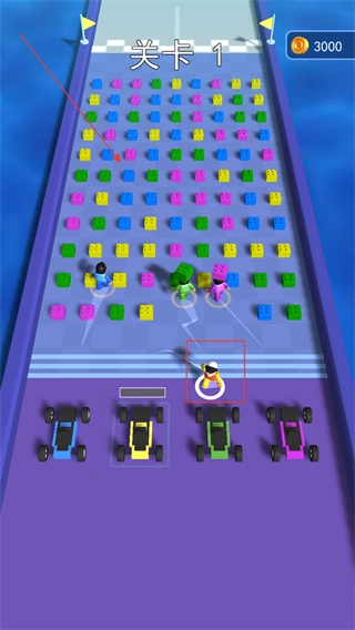 在关卡开始界面观察赛道上的彩色方块分布和其他角色,点击选定自己操控的赛车与角色,之后赛车便会自动启动驶入赛道展开挑战。