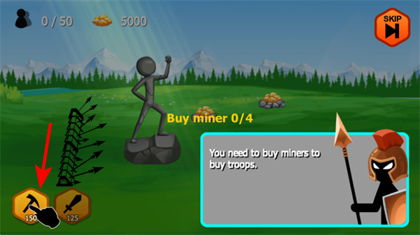 1、在游戏初始界面,点击矿工类道具可招募矿工单位,矿工是获取资源如金币的核心,解锁以支撑后续的军队招募。