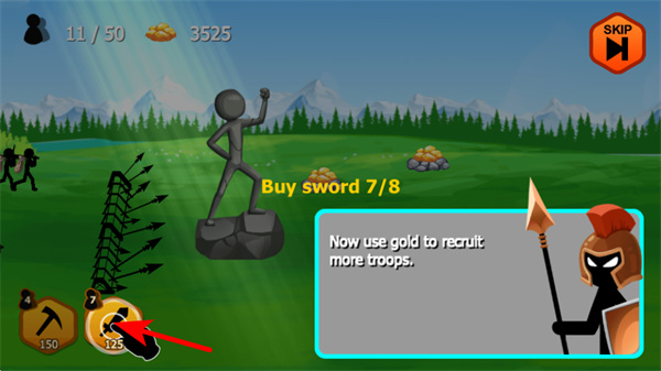 2、积累资源后,点击武器类道具如剑可提升军队的装备等级,增强士兵的战斗能力,为后续的敌方进攻做战力铺垫。