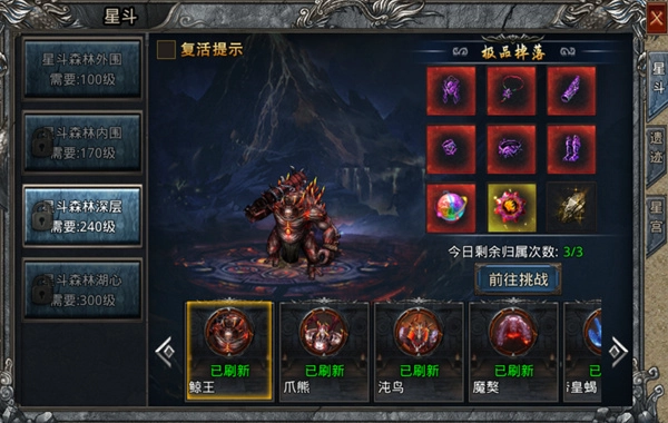 游戏里当玩家等级升到100级时,就能前往星斗森林挑战怪物了。这片森林划分成外围、内围、深层和湖心四个难度各异的区域,区域难度越高,成功击败BOSS后所能获得的掉落装备品质就越出色。每天能够获取的归属次数最多是3次,推荐大家每天都把次数用完哦~
