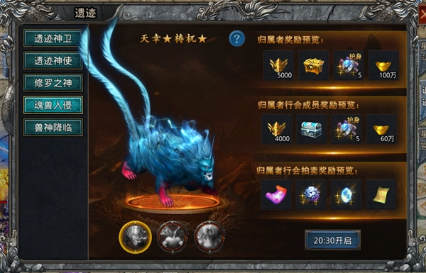 开服25天后的20:30,遗迹地图会开启跨服魂兽入侵活动。活动启动时,会出现三只魂兽怪物,行会成员能够通过击败怪物获取奖励,并且每一次活动仅允许进入一张地图。怪物被击败后,归属者以及地图内的同行会成员会得到击败奖励,还有部分极品奖励会进入行会拍卖环节。