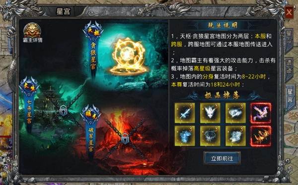 当玩家转生等级达到18转后,就能前往对应的星宫地图挑战BOSS了。天枢·贪狼星宫地图包含本服和跨服两个区域,地图霸主具备强劲的攻击实力,成功击杀它有机会获得高星级的星宫装备。此外,长生·七杀星宫地图和摇光·破军星宫地图也正等待着玩家解锁,赶紧去探索一番吧!