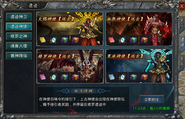 其中上古神使的可击杀时段为每日11点至23点,刷新周期为每2小时一次。成功击杀不同的神使,将有机会分别获得火焰法典、血煞法典、修罗宝典以及寒冰法典。这些法典可用于供奉修罗神,从而获取丰厚奖励。