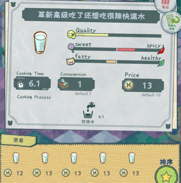 客人不会觉得价格高或者分量少,毕竟你已经用水把各项数值都调到最低了(之前在办公区的店试过,用这道菜也能拿到星星),换好菜品后继续挂机就行。