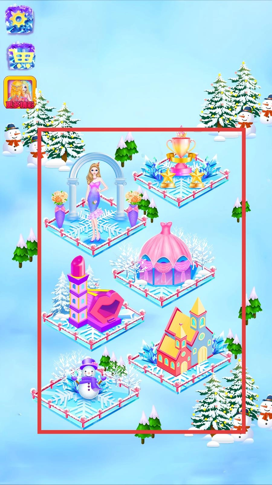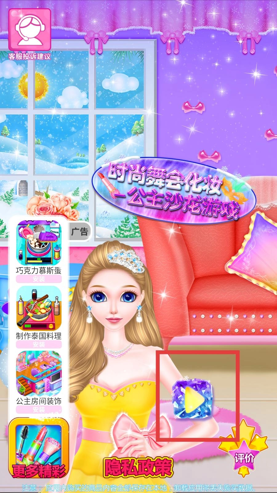启动时尚舞会化妆应用后,会进入初始界面,该界面呈现公主的形象;点击人物旁边的钻石按钮,即可进入场景选择页面,此页面展示了多个装饰场景。