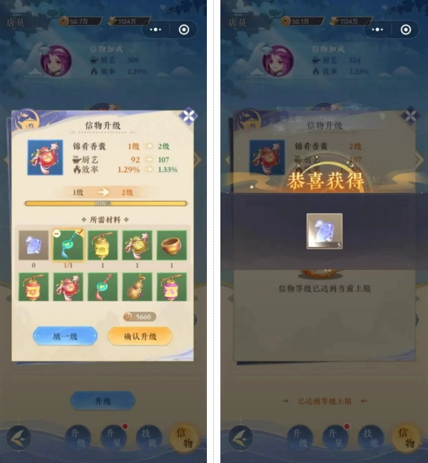 除了上述培养店员的几种方法外,还能借助佩戴[信物]来增强店员的能力。[信物]可通过【万铺争鸣】活动获取。[信物]的升级相对容易,既可以用[灵韵]进行升级,也能将多余的[信物]分解成升级需要的材料。