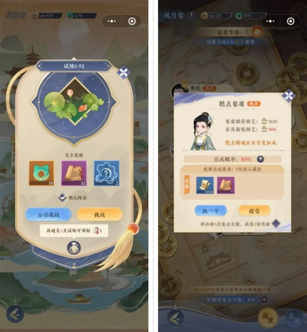 【宴席】的难度和奖励会随着店铺等级的提高而增加,要是厨艺暂时没跟上,可以挑选难度等级低一些的宴席来承接。完成的概率越大,我们就能越早拿到奖励。