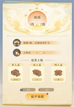 除了对店铺和设备进行升级,茶馆的掌柜们还得留意提升茶馆的规模。规模提升之后,不仅店面能够扩大、餐桌数量可以增加,店员能够上阵工作的数量也会随之增多!